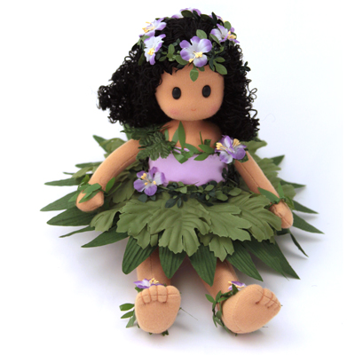 A handmade musical Hawaiian Doll that plays "Aloha Oe". Wind her up and she plays for almost 3 minute while her head moves. 10.5" tall, around 6" tall when sitting.